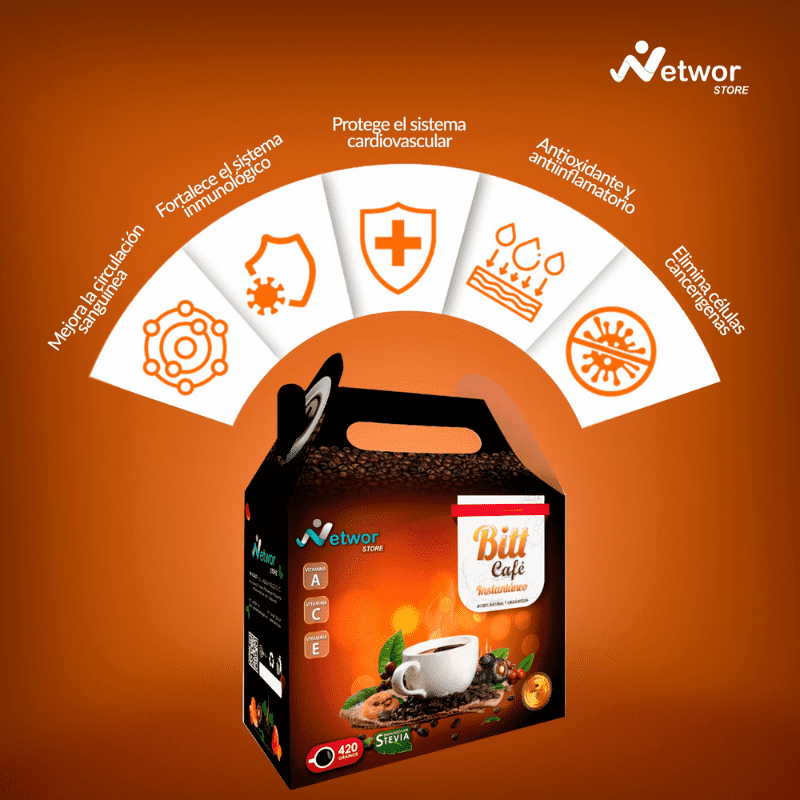 Bitt Café, el café sin cafeína que revitaliza tu día. Con moringa y ganoderma, fortalece tu sistema inmunológico, mejora la circulación y es antioxidante.
